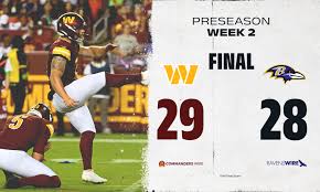 Los Washington Commanders lograron cortar la racha ganadora de los Ravens de 24 partidos seguidos ganados este pasado Lunes, 20 de Agosto, en un partido muy disputado que terminó 29-28 a favor de los de Washington. Los Commanders lograron darle la vuelta al marcador luego de ir perdiendo 28-20 en el último cuarto, gracias a un touchdown de J. Patterson a pase de 15 yardas de J. Fromm, y un field goal de J Slye de 49 yardas en los últimos 10 segundos del partido para llevarse la victoria en la batalla del Beltway.